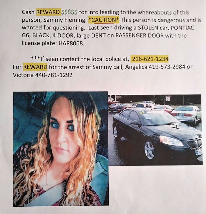 According to public court records her most recent address is listed at 10653 Indian Hollow in Elyria, Ohio. We’ve also received information that Sammy frequently stays in the apartments located off of Pearl Rd. & Cecilia Rd. in Old Brooklyn.
