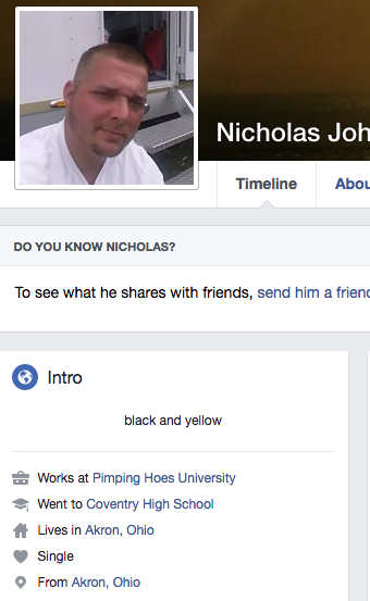 Nicholas goes by his real name, Nicholas Johnson on Facebook where his current occupation is listed at “Pimping Hoes University” and his marital status is single. He’ll be staying single forever if he keeps this kinda trash up.