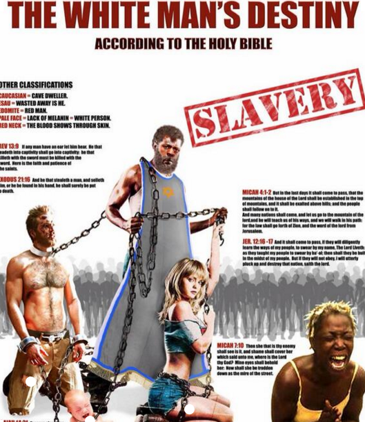 SCUMBAGGED Tip: Saying things like those who subjected those to slavery will be sent to eternal damnation for their ancestors crimes is outrageous. If that’s the case, then every single race and creed would face this same fate, for all colors subjected others into slavery at one point or another throughout history. Racism and supremacy is a nasty abhorrent evil that has inserted itself into the hearts of many whites and many blacks and things like this only create further divide. Perhaps this group should start preaching peace and understanding and trying to cross the race barrier instead of trying to further deepen it.