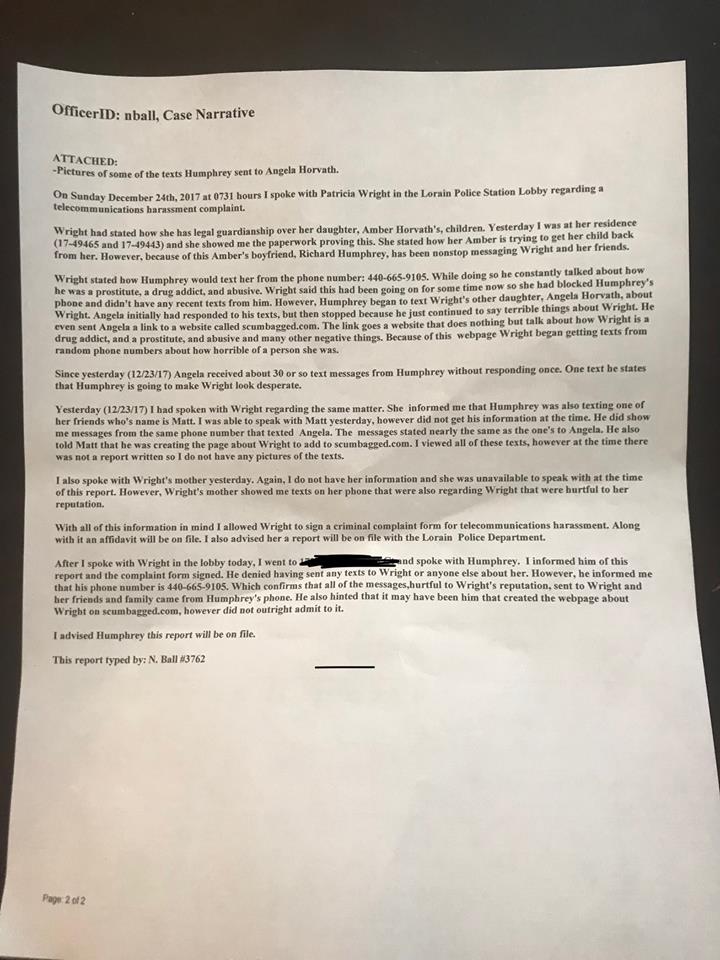 The telecommunications complaint against Richard Humphrey stems from the advice of none other than Lori Pinero.  Mrs. Pinero is friends with Patricia Wright and has guided her friend in her decision making.  The young mother was either faced with threats of the police or to take down the article (these statements have been also submitted but are being reserved for the court room).  In those statements Mrs. Pinero can be seen urging Mrs. Horvath to remove the post because the police will be called.  Unfortunately for Mrs. Horvath she couldn’t remove the post, nor could Mr. Humphrey.  The following police record below shows the complaint lodged against Mr. Humphrey with the Lorain County Police Department.