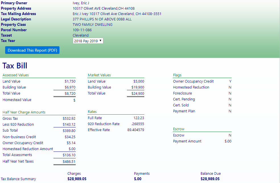 According to Cuyahoga County Records, Eric J. Ivey has an abandoned property in Cleveland located at 10317 Olivet Ave. He has failed to pay property taxes for more than a decade and owes for grass cutting, is delinquent in his sewage and water fee’s and even owes money for city board-ups done on the property.